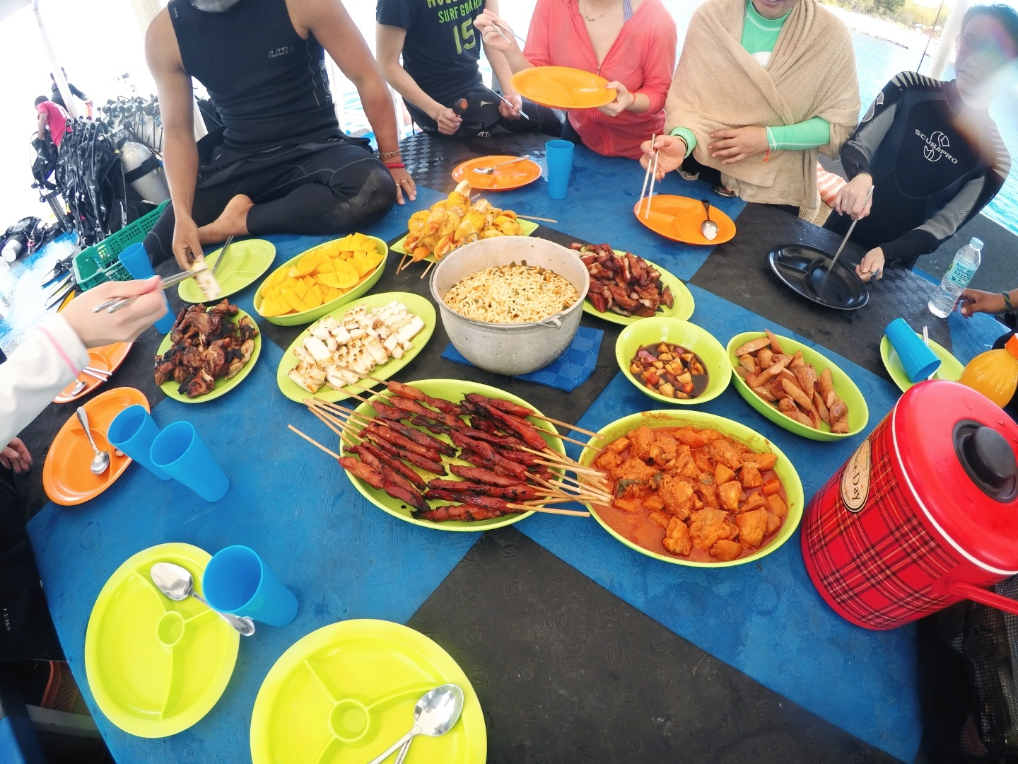 오전 한 타임을 다이빙하고 나면 이렇게 배 위에 고기랑 라면이랑 냠냠~