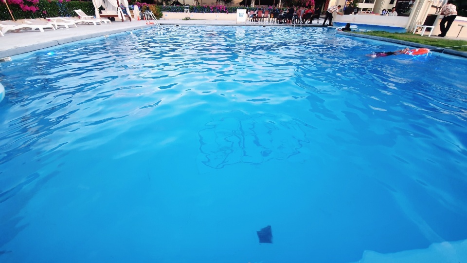 풀장 물속에 파란 조명이 설치되어 있어서