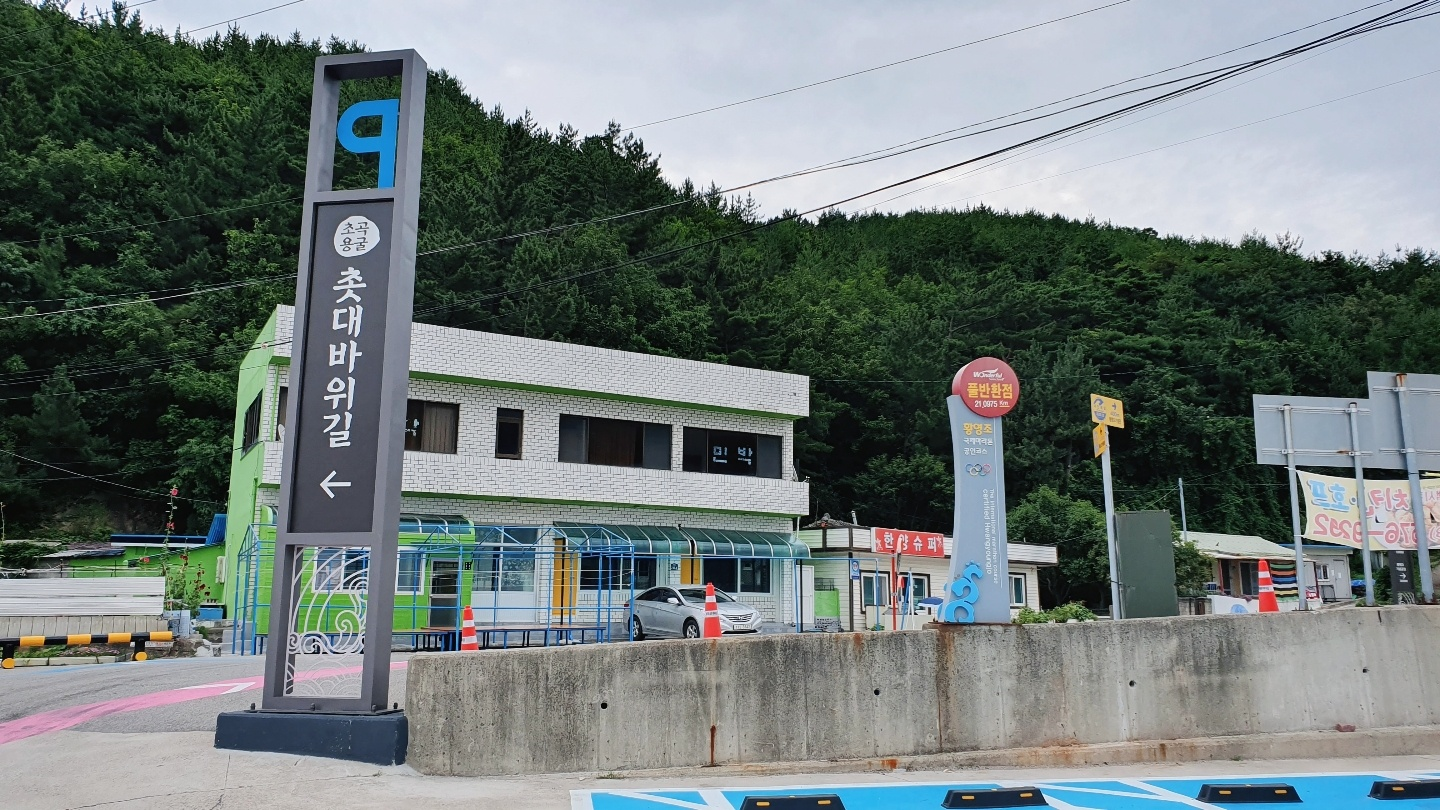 아침밥 먹고 펜션에서 3분쯤 거리에 있는 촛대바위길을 가보기로 했어요.