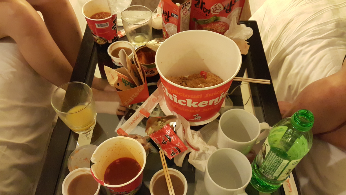 체크인하고 밖에 나가서 근처 졸리비에서 치킨 포장해서 또 드링크!