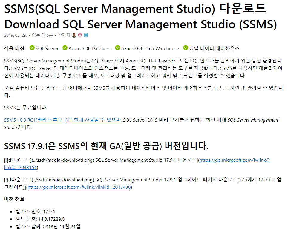 SQL Server Management Studio 17.9.1 업그레이드 패키지 다운로드(17.x에서 17.9.1로 업그레이드)